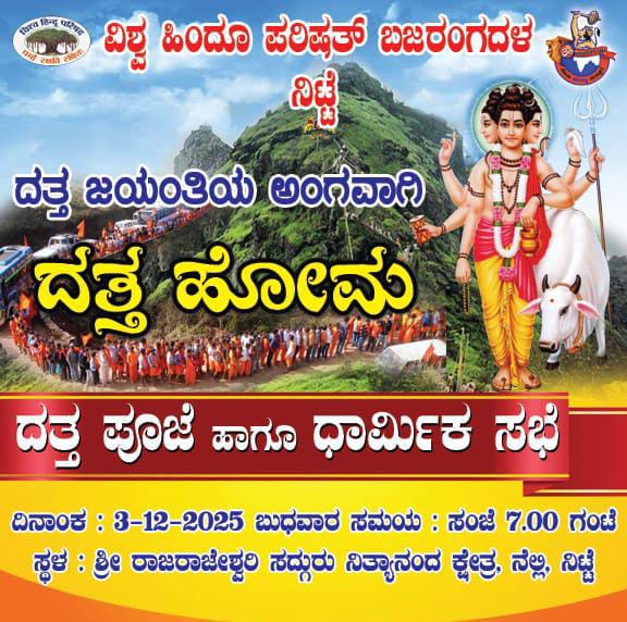 ವಿಶ್ವ ಹಿಂದೂ ಪರಿಷತ್ ಬಜರಂಗದಳ ನಿಟ್ಟೆ ದತ್ತ ಜಯಂತಿಯ ಅಂಗವಾಗಿ ದತ್ತ ಹೋಮವು ಡಿಸೆಂಬರ್ 03-12-2025 ನೇ ಬುಧವಾರದಂದು ಸಮಯ 7 ಗಂಟೆಗೆ ಸರಿಯಾಗಿ ದತ್ತ ಪೂಜೆ ಹಾಗೂ ಧಾರ್ಮಿಕ ಸಭೆಯು ಶ್ರೀ ರಾಜರಾಜೇಶ್ವರಿ ಸದ್ಗುರು ನಿತ್ಯಾನಂದ ಕ್ಷೇತ್ರ ನೆಲ್ಲಿ ನಿಟ್ಟೆಯಲ್ಲಿ ನಡೆಯಲಿದೆ ಎಂದು ಪ್ರಕಟಣೆಯಲ್ಲಿ ತಿಳಿಸಿದ್ದಾರೆ